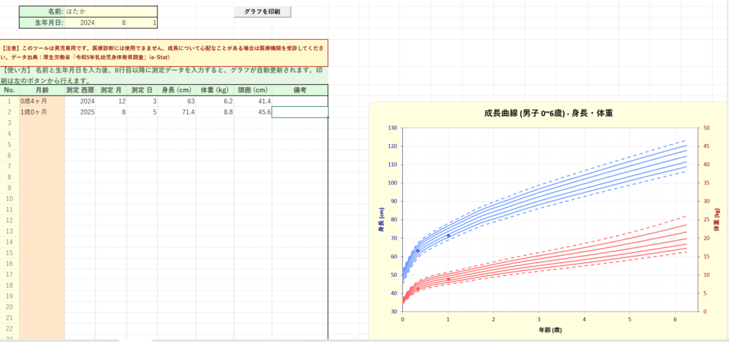 これにより、手書き時よりも正確に描画できると共に、その子の身体的な成長状態を把握する際に役立ちます。また、今回提供しているツールは、総務省統計局のe-Statから出ている、厚生労働省が実施した最新の乳幼児身体発育調査(2023年実施)のデータを元に作成しています。そのため、胸囲のデータはないことを、ご承知おきください。