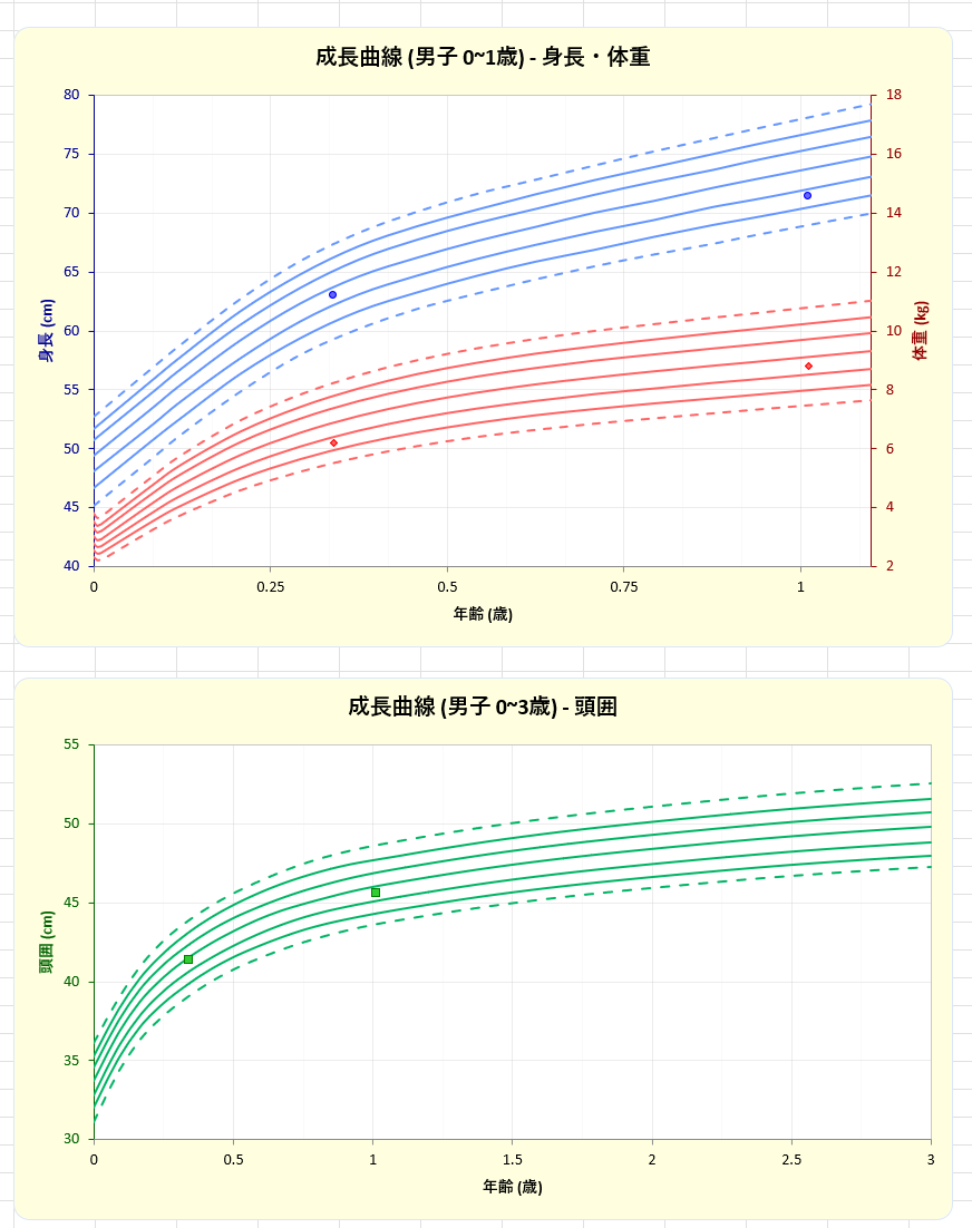 身長・体重・頭囲(頭囲については3歳まで)の値を入力すると、自動的に成長曲線内にプロット(点を打つ)されるものです。