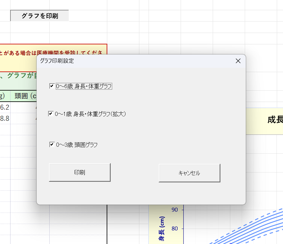 印刷したいグラフを選択する画面が表示されるので、チェック後に「印刷」